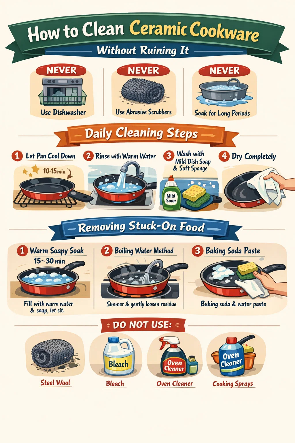 Ceramicum crustulum aqua calida purgandum est, paucae guttae saponis, et spongia mollis vel pannus — statim postquam refrixerit. In elutoria numquam pone, numquam laesuras scrutatores uteris, neque longius tempus maceres. Hae tres regulae solae vitam tellus crustulorum tuorum ceramici non-sticuli significanter extendent.