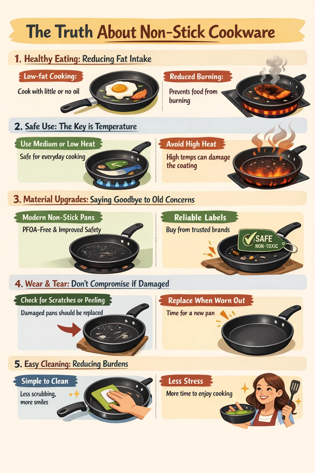 Temperatura altissimas vitare: hae lebetes maxime timent ne "ardorem aridam" vel plenam caloris adhibeant. Si temperatura nimis alta est, laedi potest litura in sartagine, et potest etiam aliquos odores ingratos emittere. Quamdiu tu non es qualis ille qui magno calore uti volet et sartagine candenti urere, tutissimum est uti.