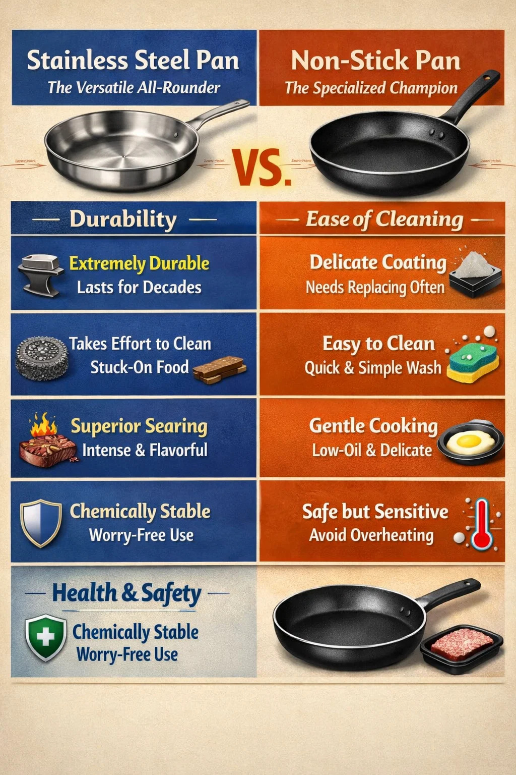 Cum eligendo crustulum, ferrum immaculatum et sartagines non fictilia, sua quaeque habent utilitates. Casus non sunt unius alterius substituti, sed magis sicut "versatilis omnium rotundior" et "specialis propugnator" in coquina.